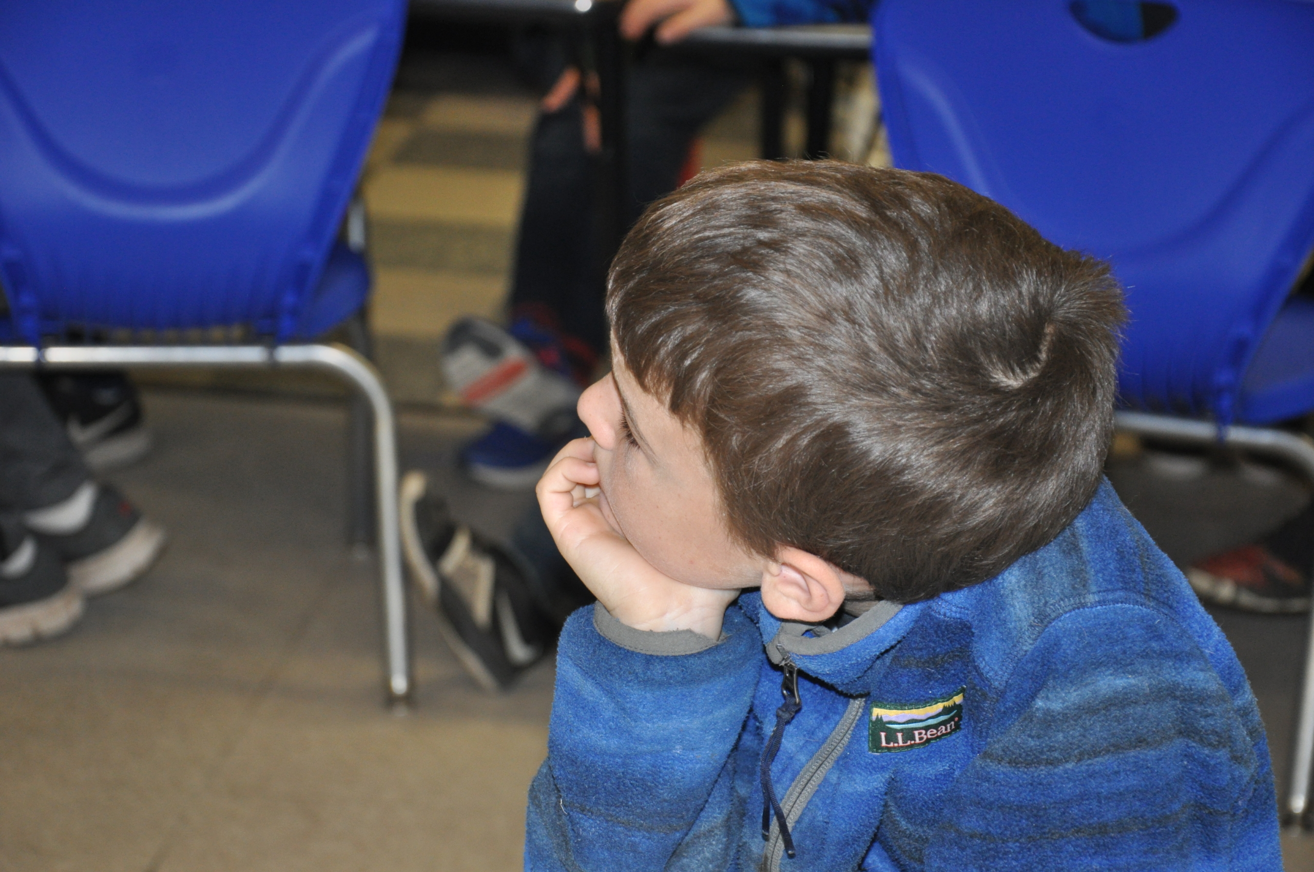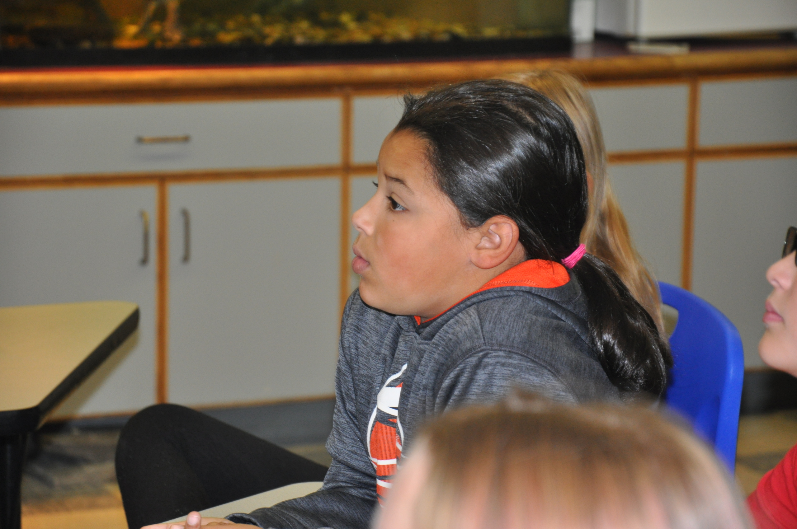 Fourth graders in Charlie Cummings Fisher Elementary School Class watch a Cubelets robot created by Mack Molding Engineering Team Leader Ann Weddell drive across the floor.